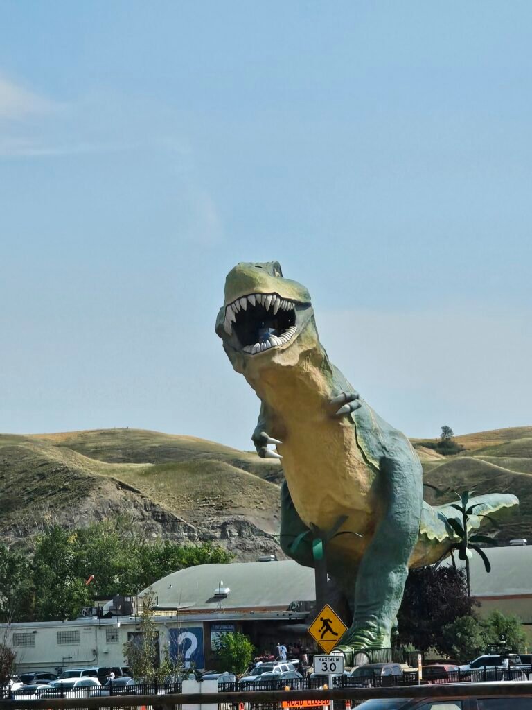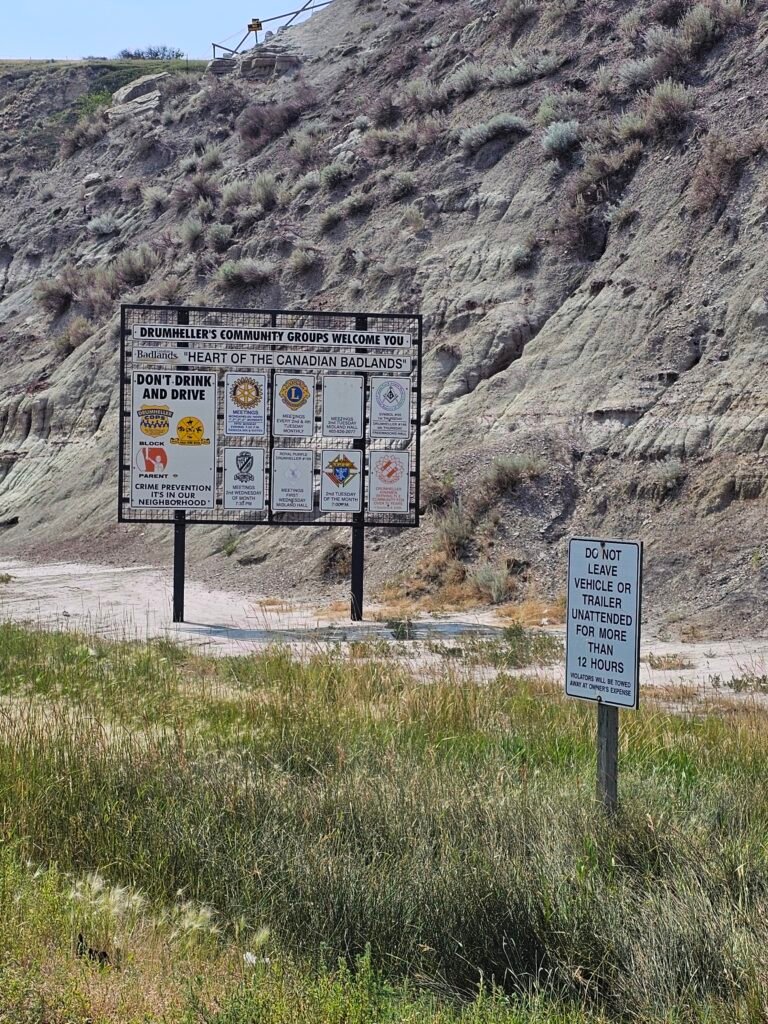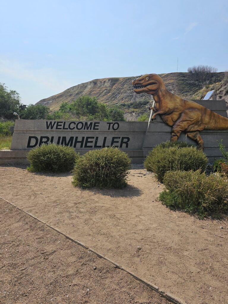 After a long drive, seeing the Welcome Sign to Drumheller was exciting—we knew we were officially entering the iconic, giant dinosaur marks the entrance to a truly unique landscape. Was interesting also to see the heart of the Canadian Badlands Sign.