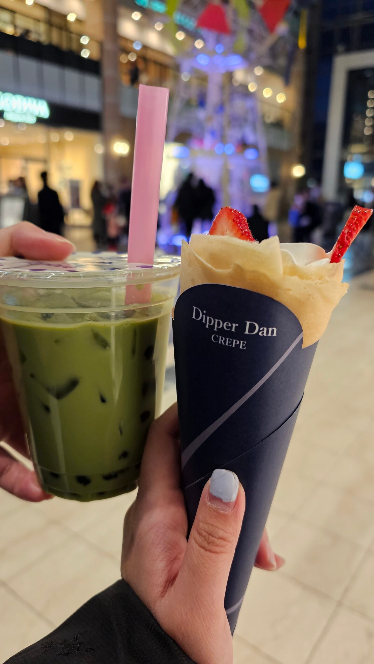 We couldn’t resist Dipper Dan at Kobe Harbourland Umie, especially with coupons from their website and a long line suggesting it was good! We tried their strawberry cream crepe and an iced matcha latte. The crepes were light, fluffy, and packed with fresh strawberries. The iced matcha latte had a rich, earthy flavor perfectly balanced with a light sweetness. It’s a great spot for a quick, sweet break while exploring Kobe Mall!